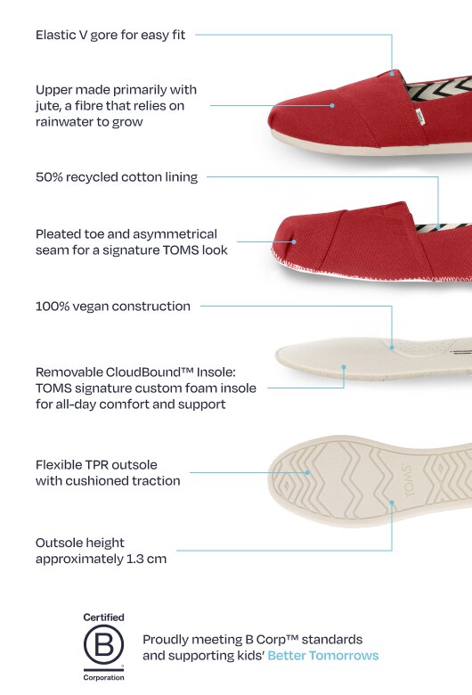 The TOMS Alpargata builds on this legacy with thoughtful materials, a relaxed silhouette and a comfort‑first design that feels just as relevant today as it did in 2006.