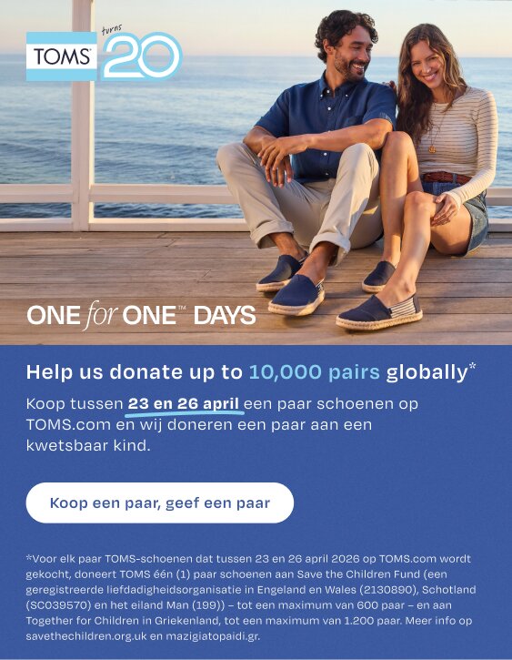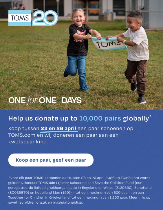 Maar TOMS is meer dan alleen schoenen: wij doen ons werk om levens te verbeteren. Jouw TOMS aankoop helpt de educatie, gezondheid en het welzijn van kinderen te ondersteunen. Samen hebben we meer dan 105 miljoen levens positief beïnvloed. Als een gecertificeerde B Corp™, zit goed doen letterlijk in onze zolen.
